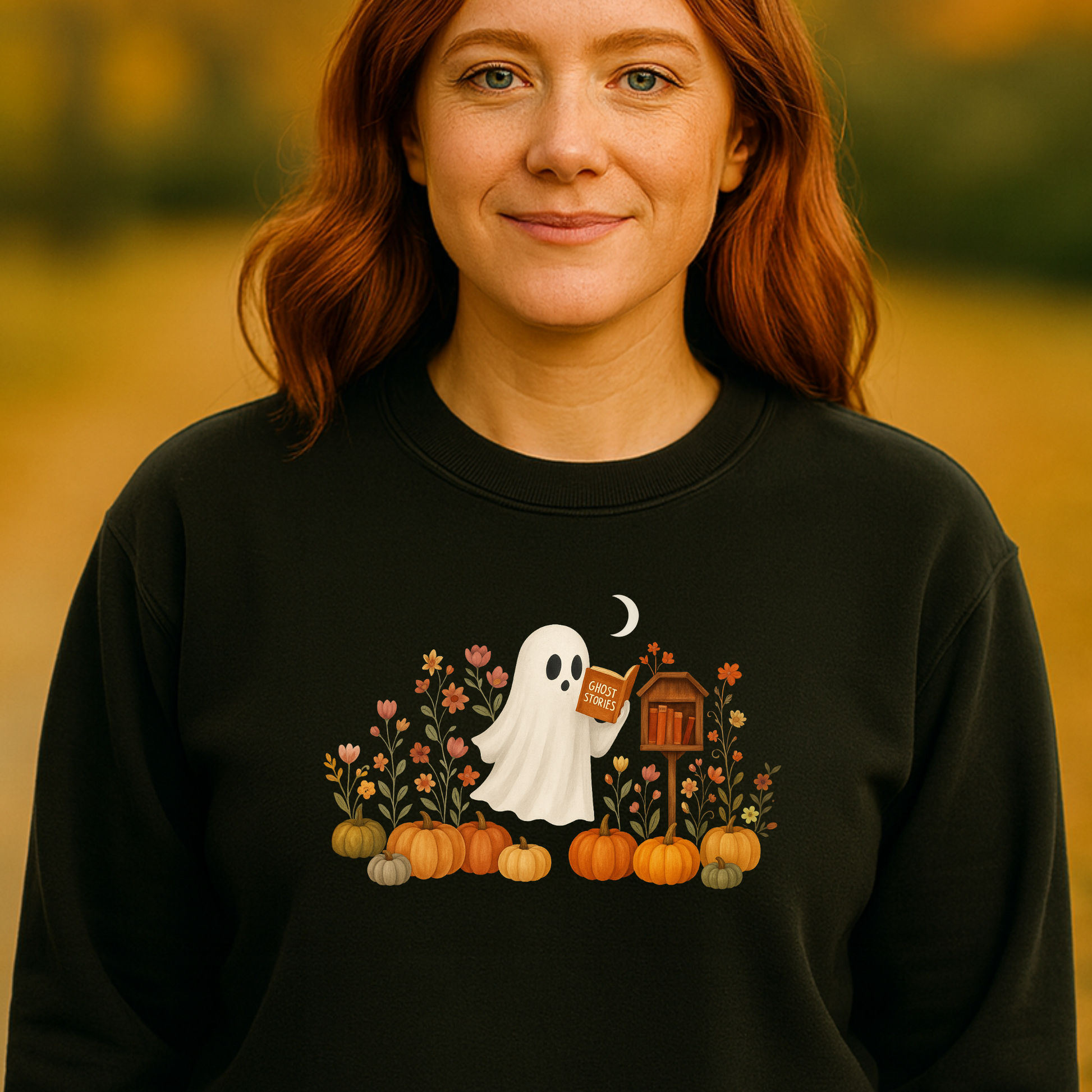 Curl up with a book in this incredibly soft cotton pullover- perfect for book lovers, fall nights, and spooky-season fans.