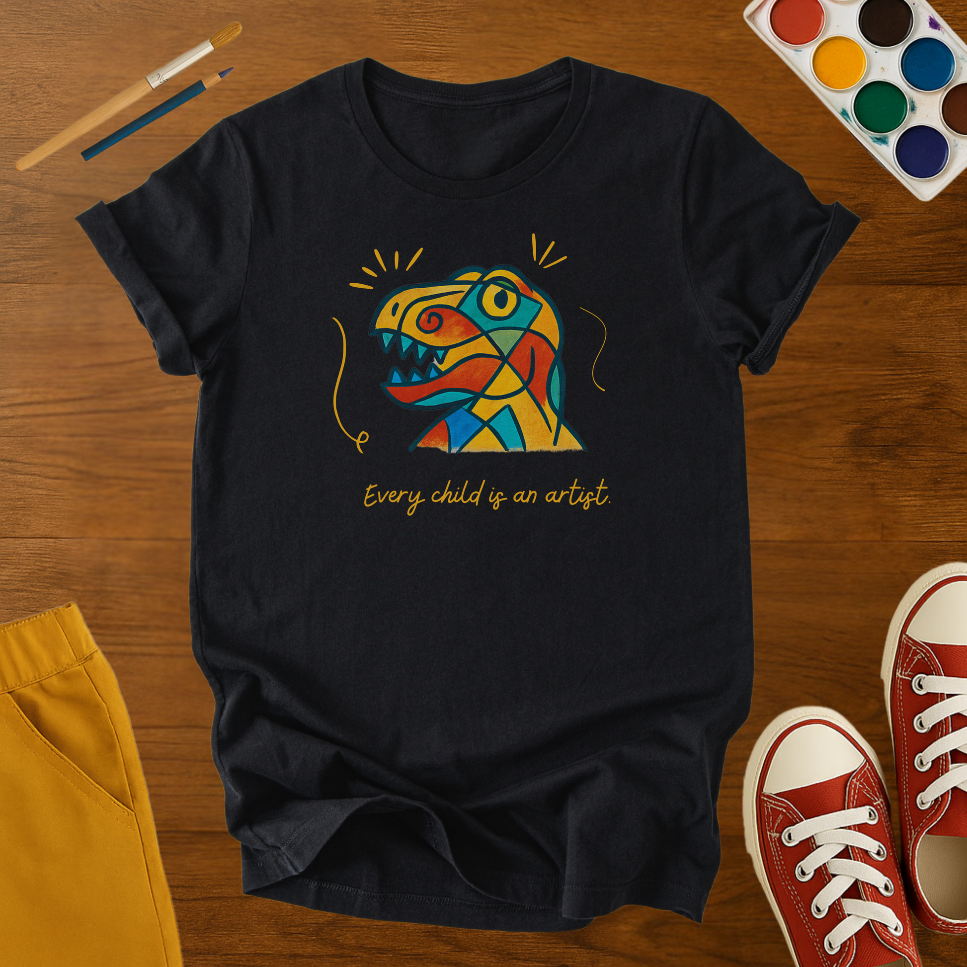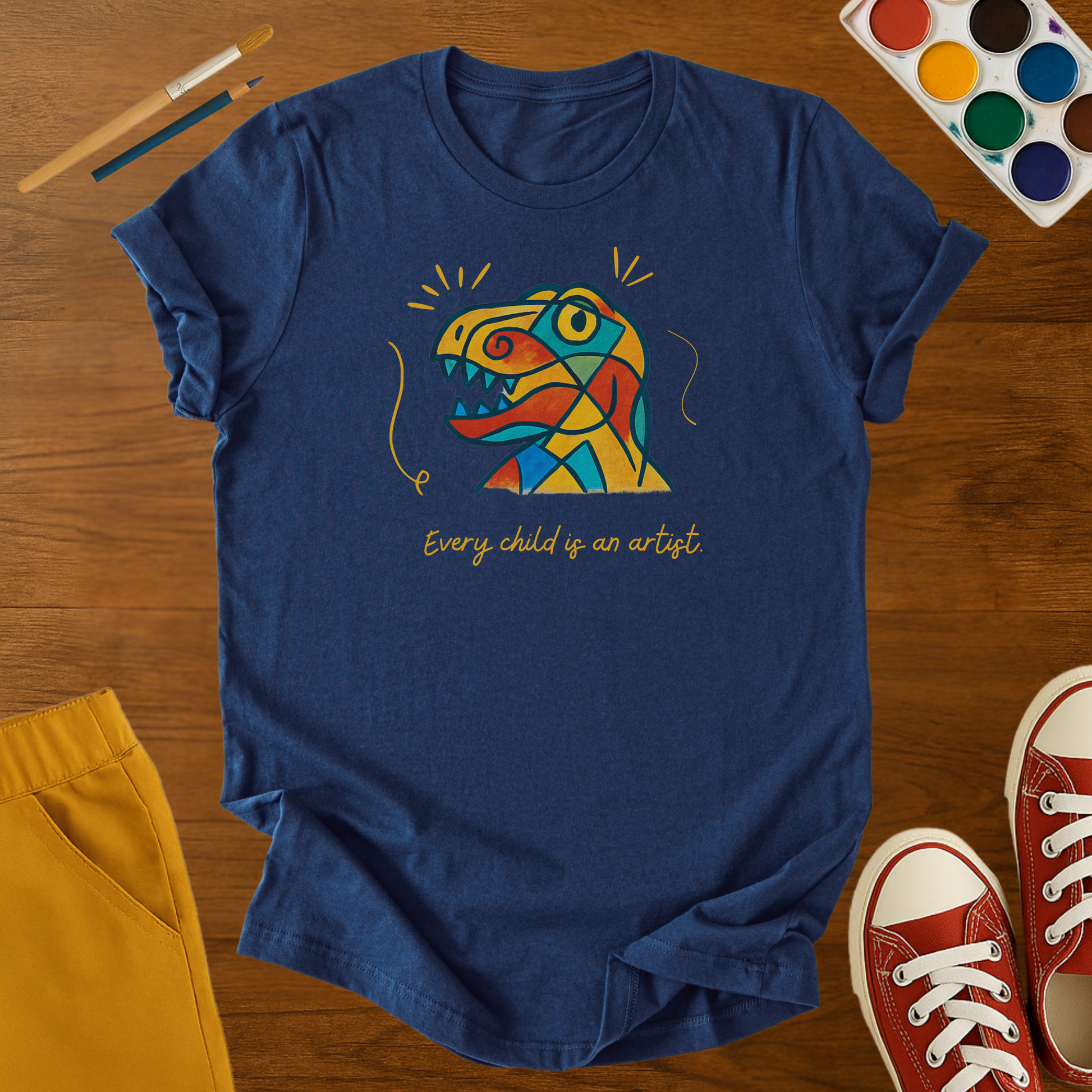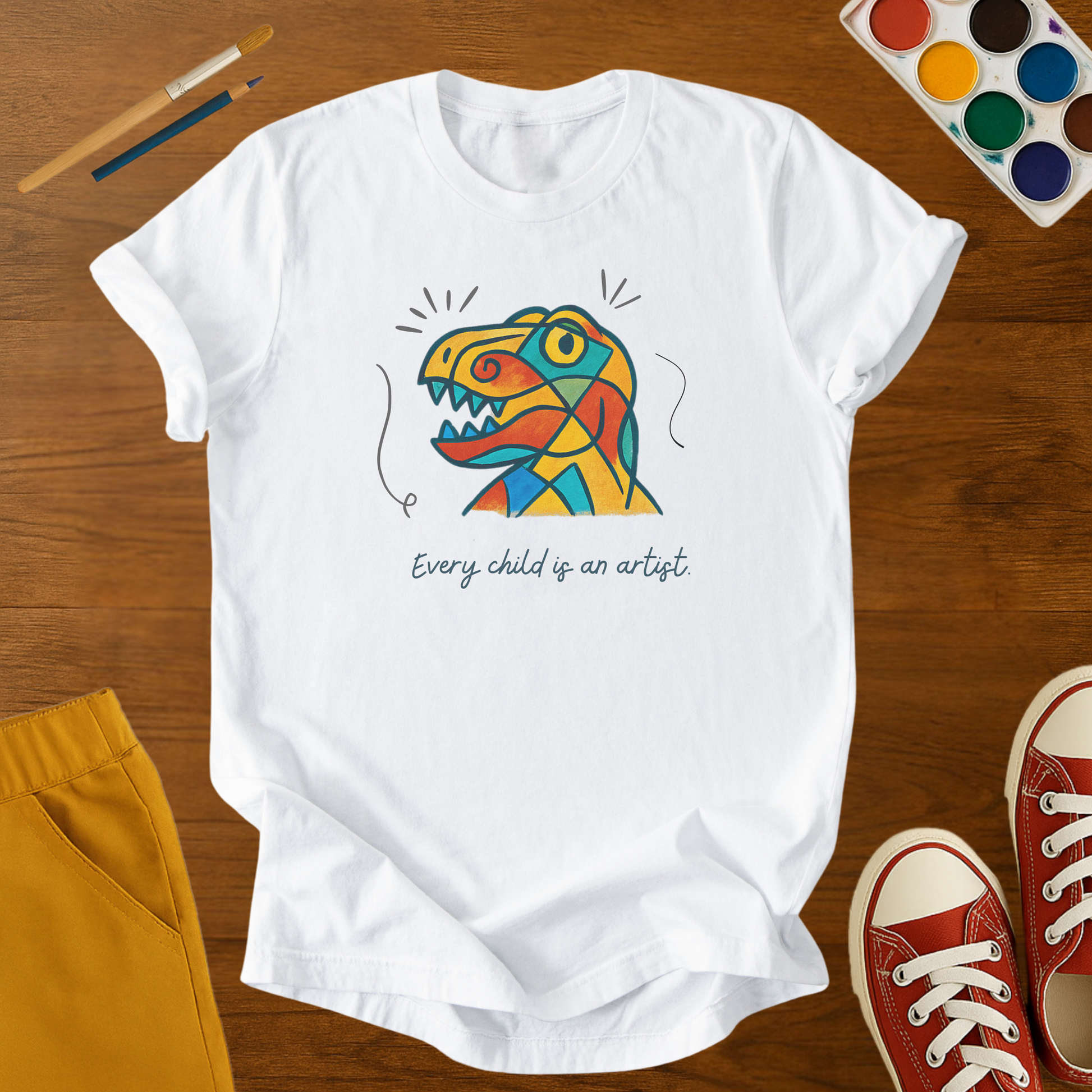 Celebrate creativity with this cubist-inspired dinosaur tee featuring the quote “Every child is an artist.”