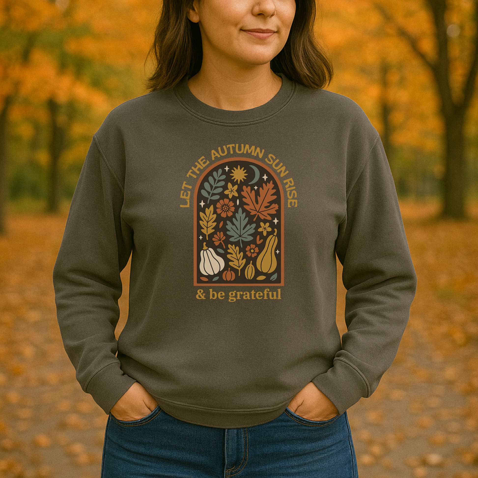 Let the Autumn Sun Rise & Be Grateful Adult Lightweight Crewneck Sweatshirt