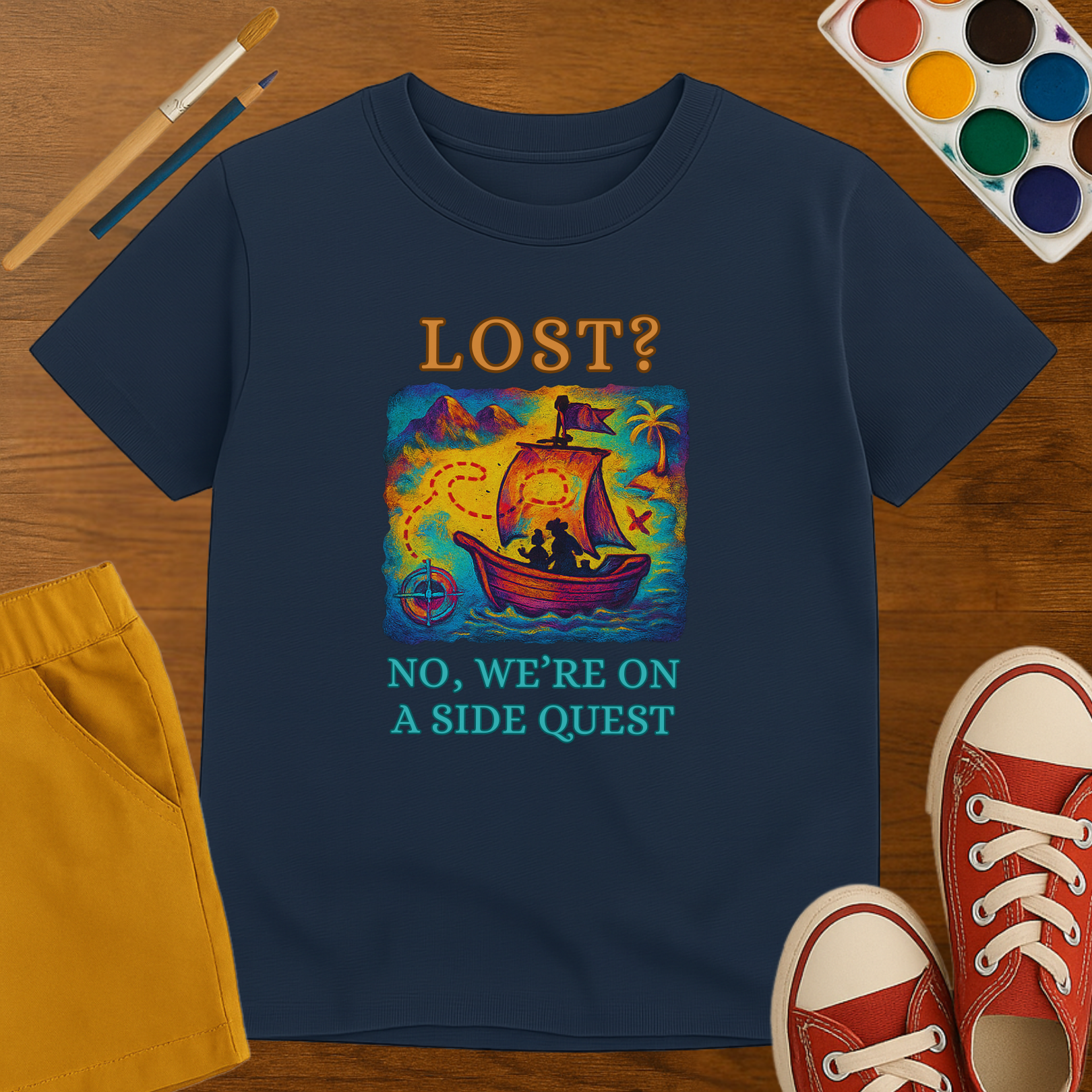Adventure awaits! This kids pirate tee features “Lost? No, we’re on a side quest” with a bold treasure map ship design.