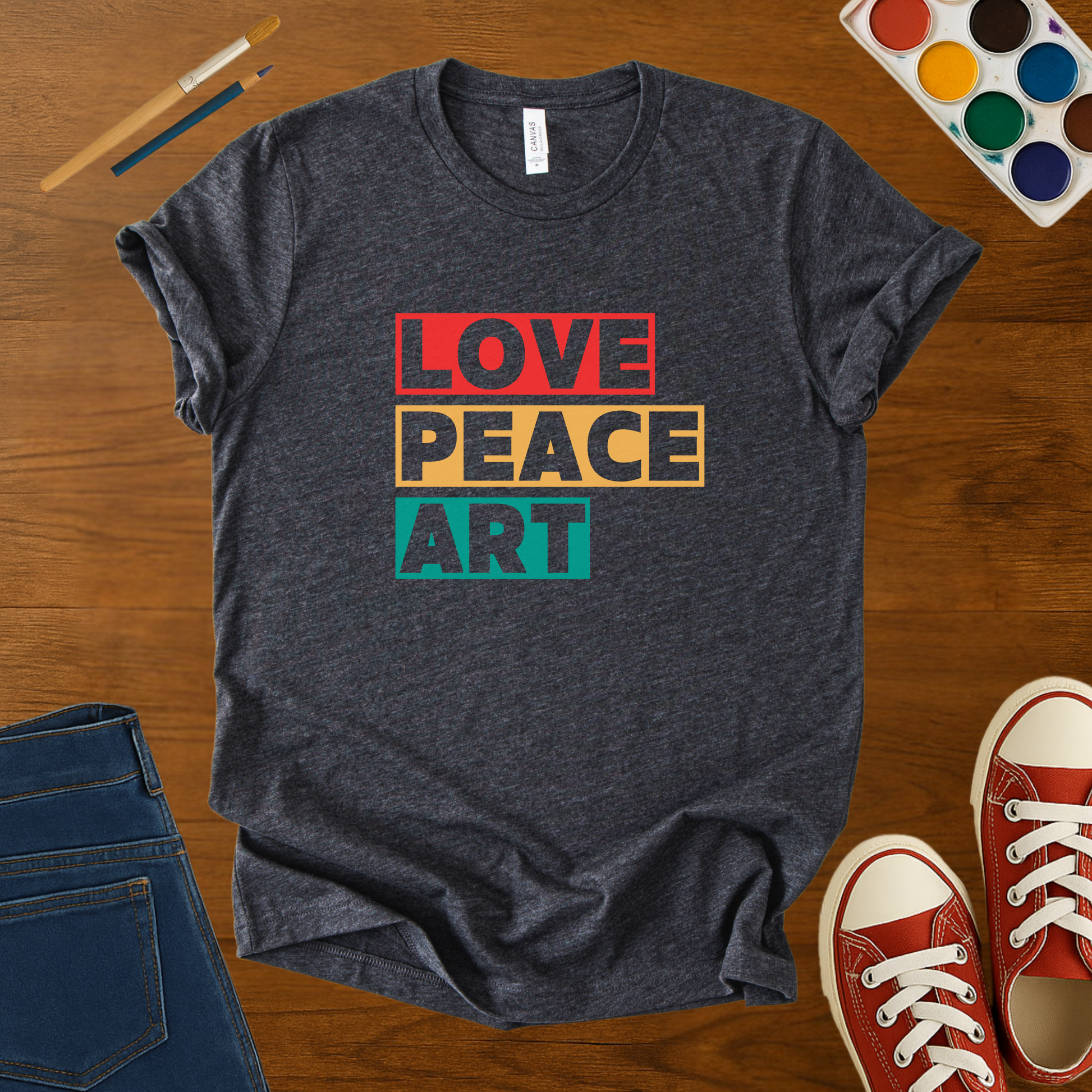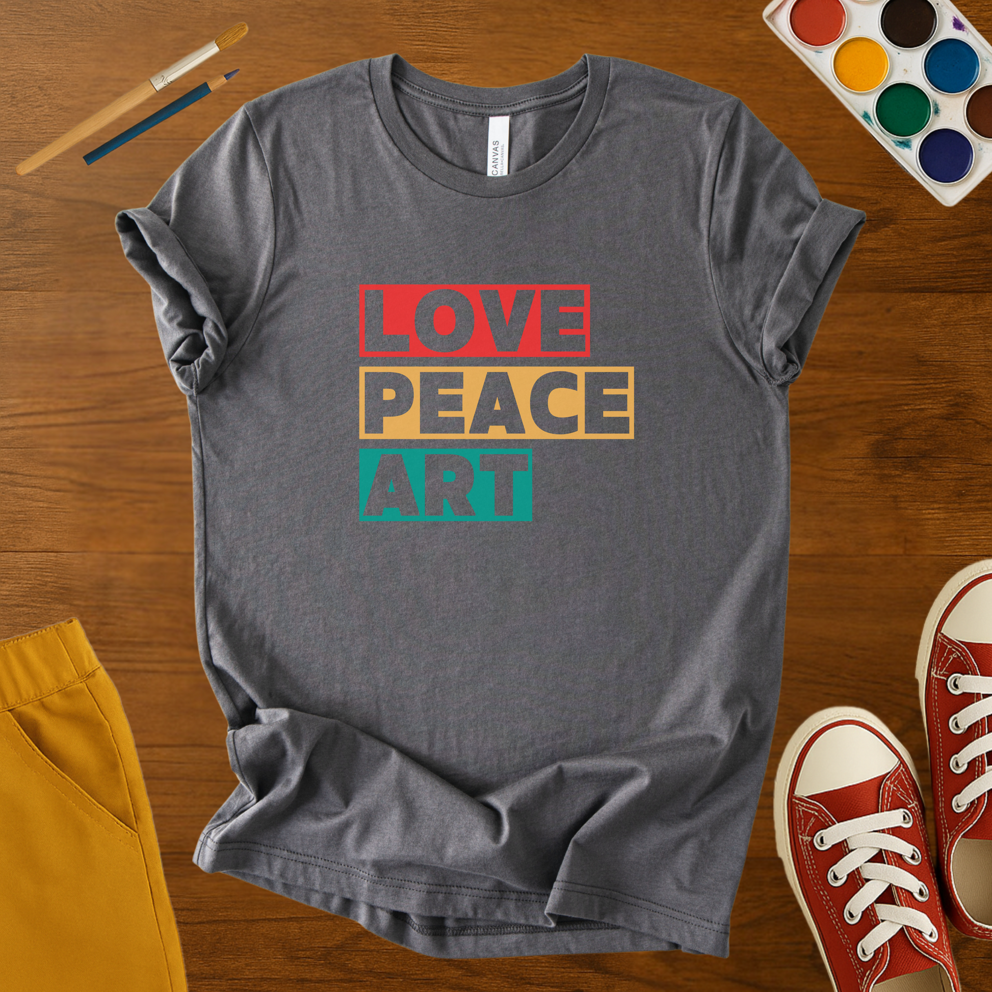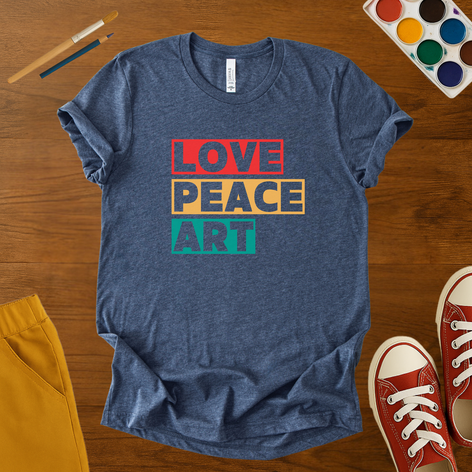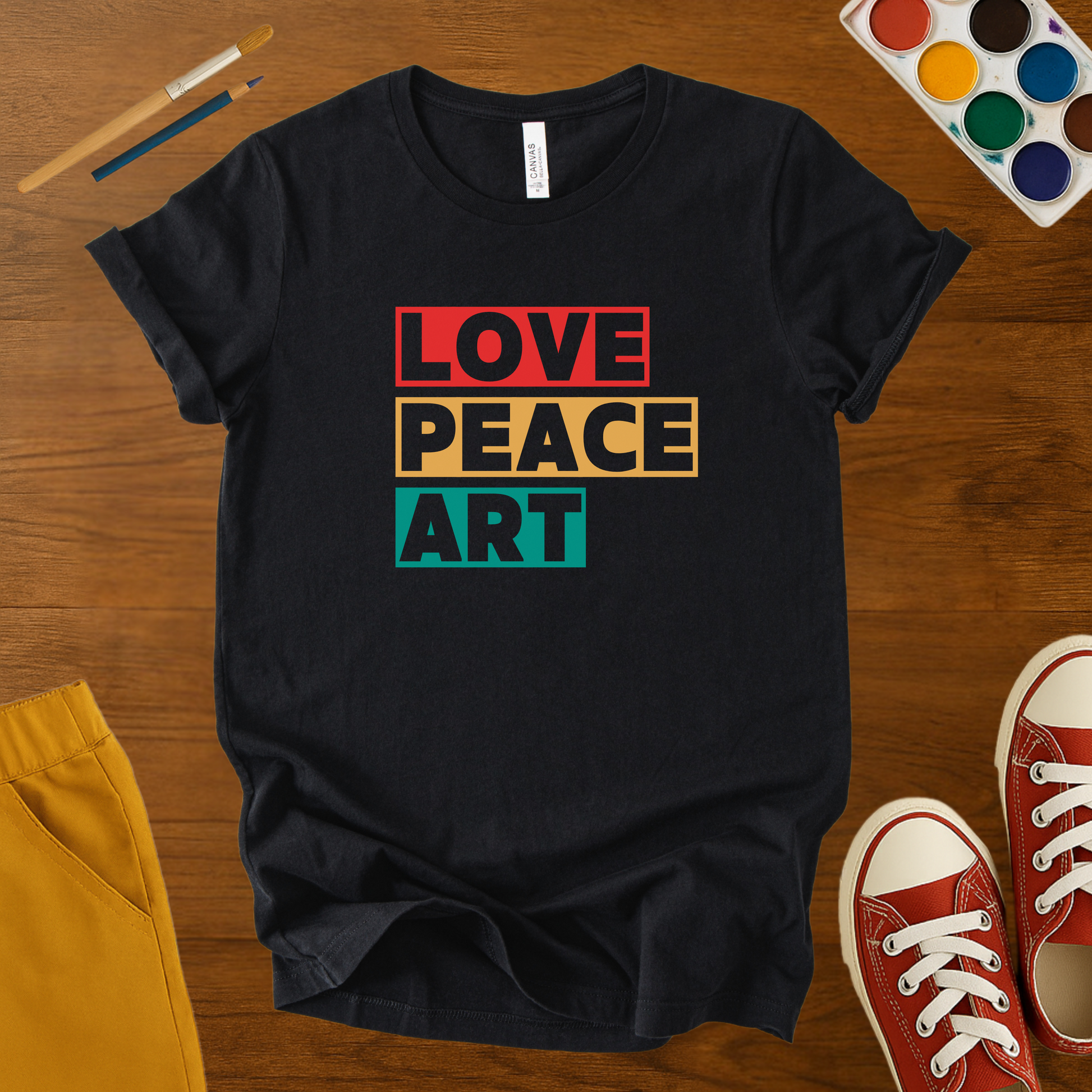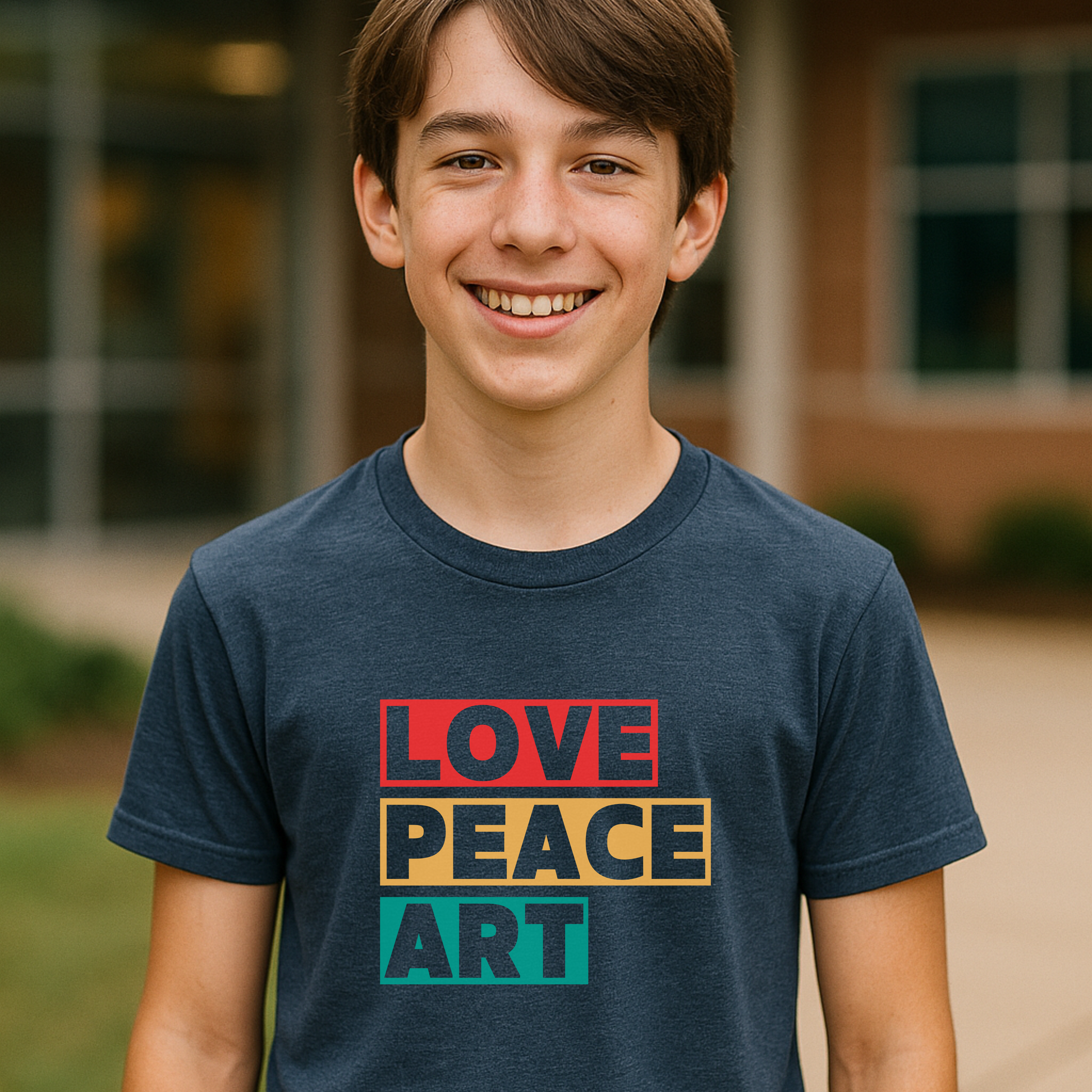 Love boldly. Live peacefully. Create freely. This colorful Love Peace Art t-shirt is a vibrant statement for kids who live out loud and create with heart.