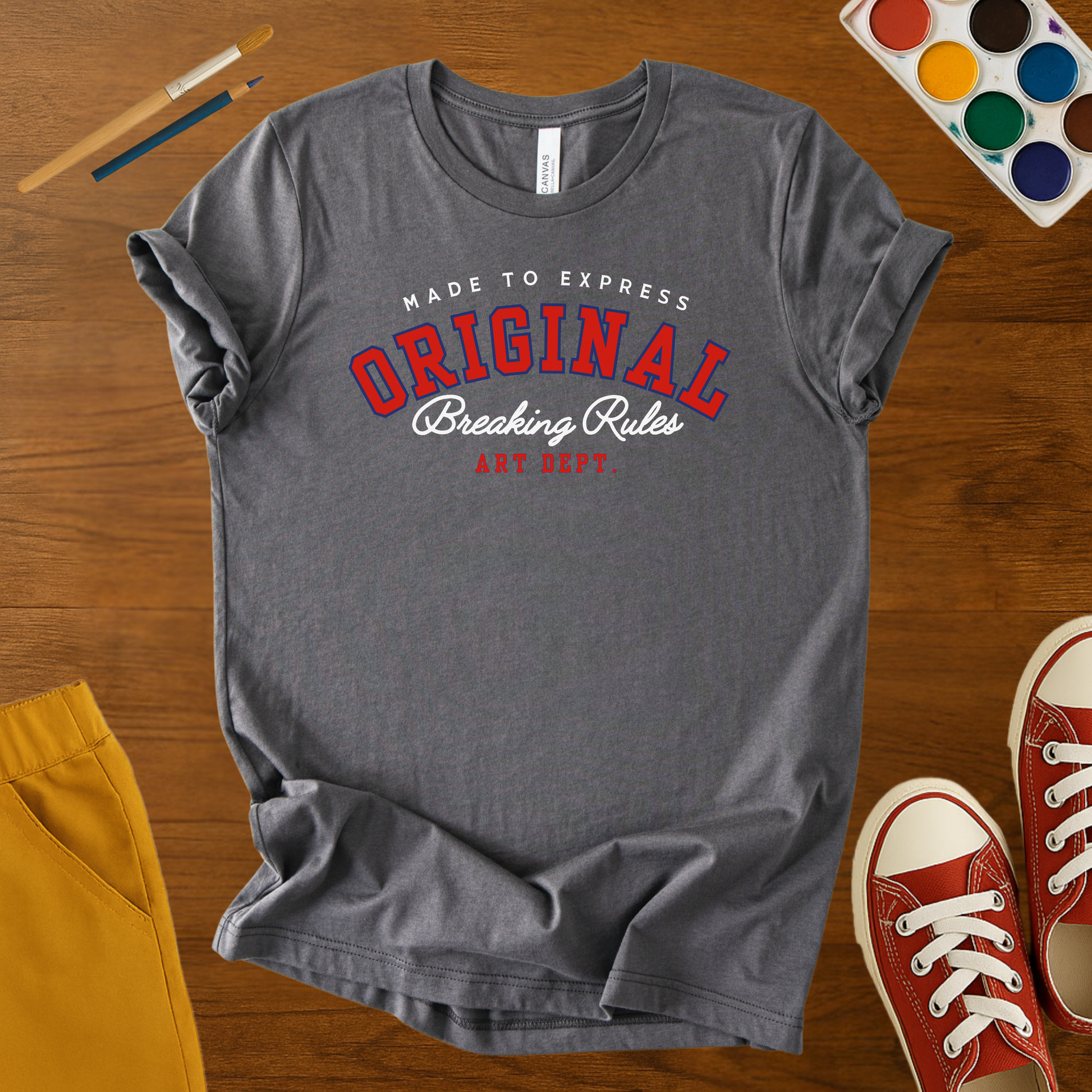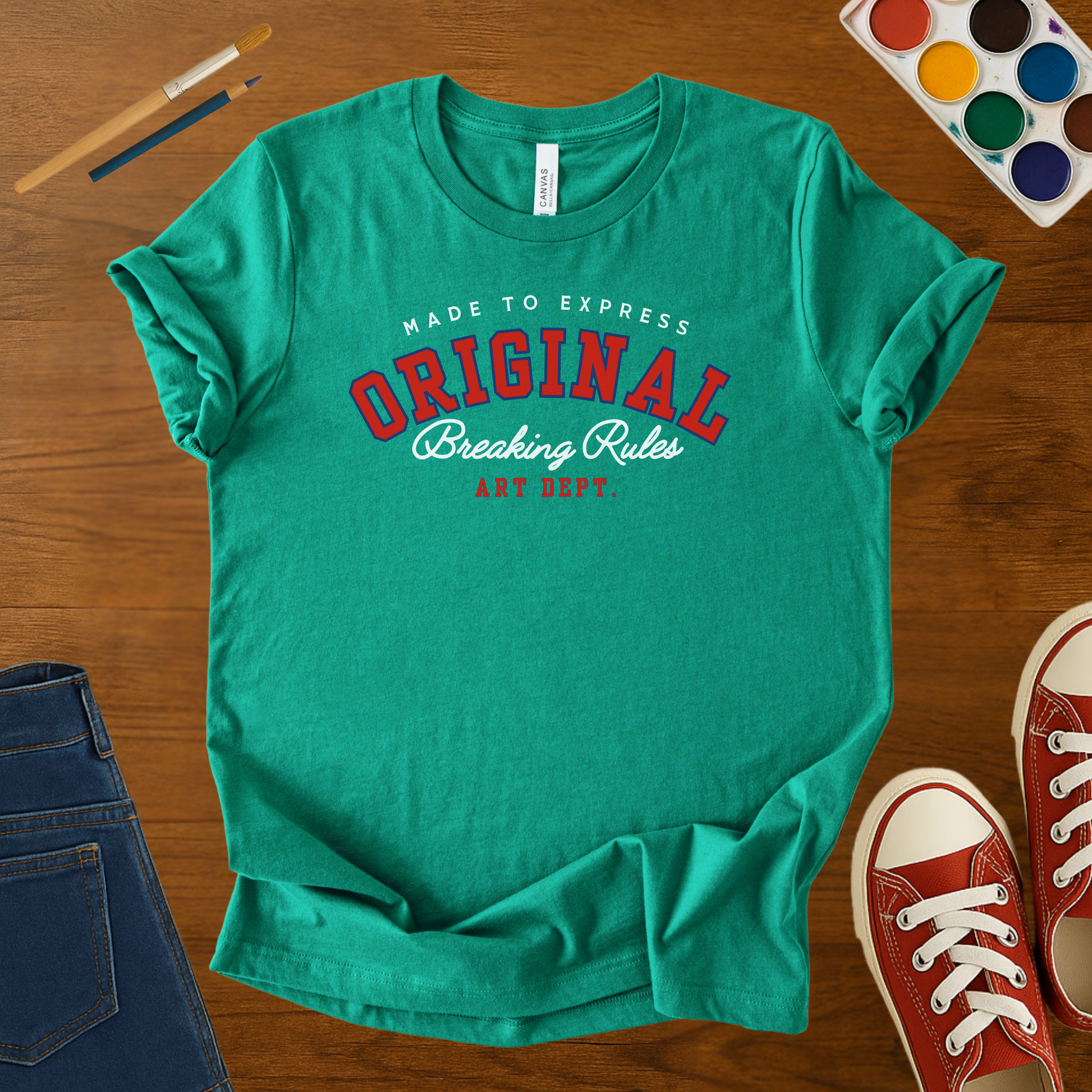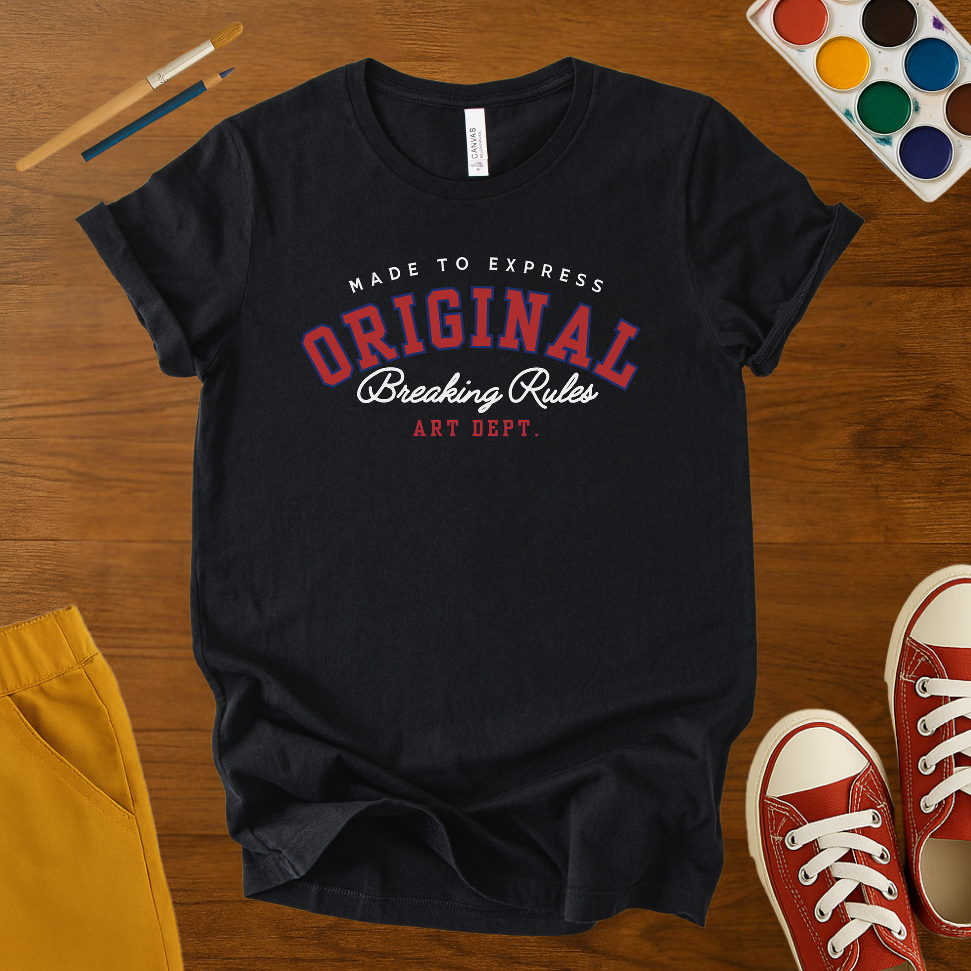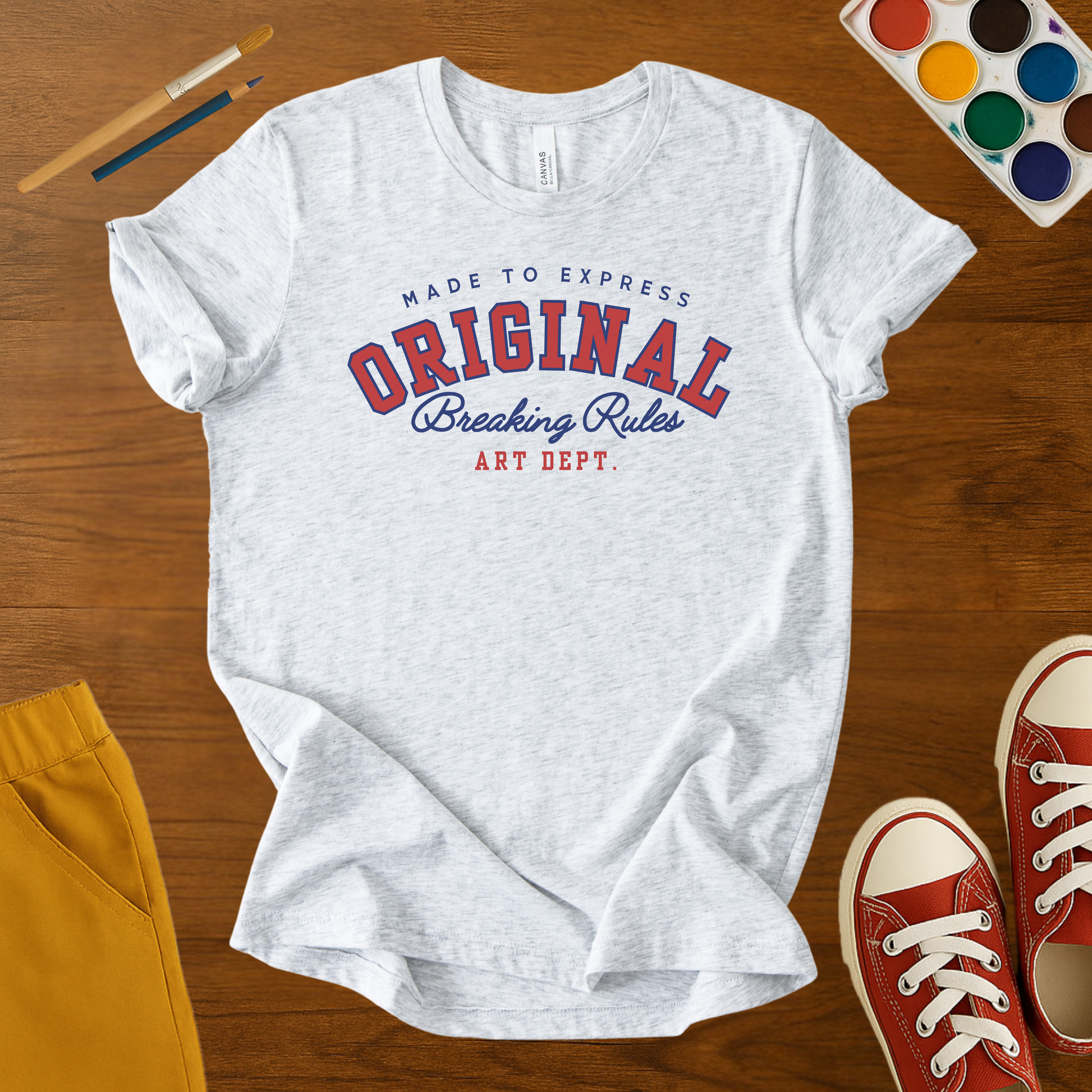 Varsity style with a rebellious streak. Made to express. Breaking rules in the best way. T-shirt for the kids who break rules with color, confidence, and creativity.