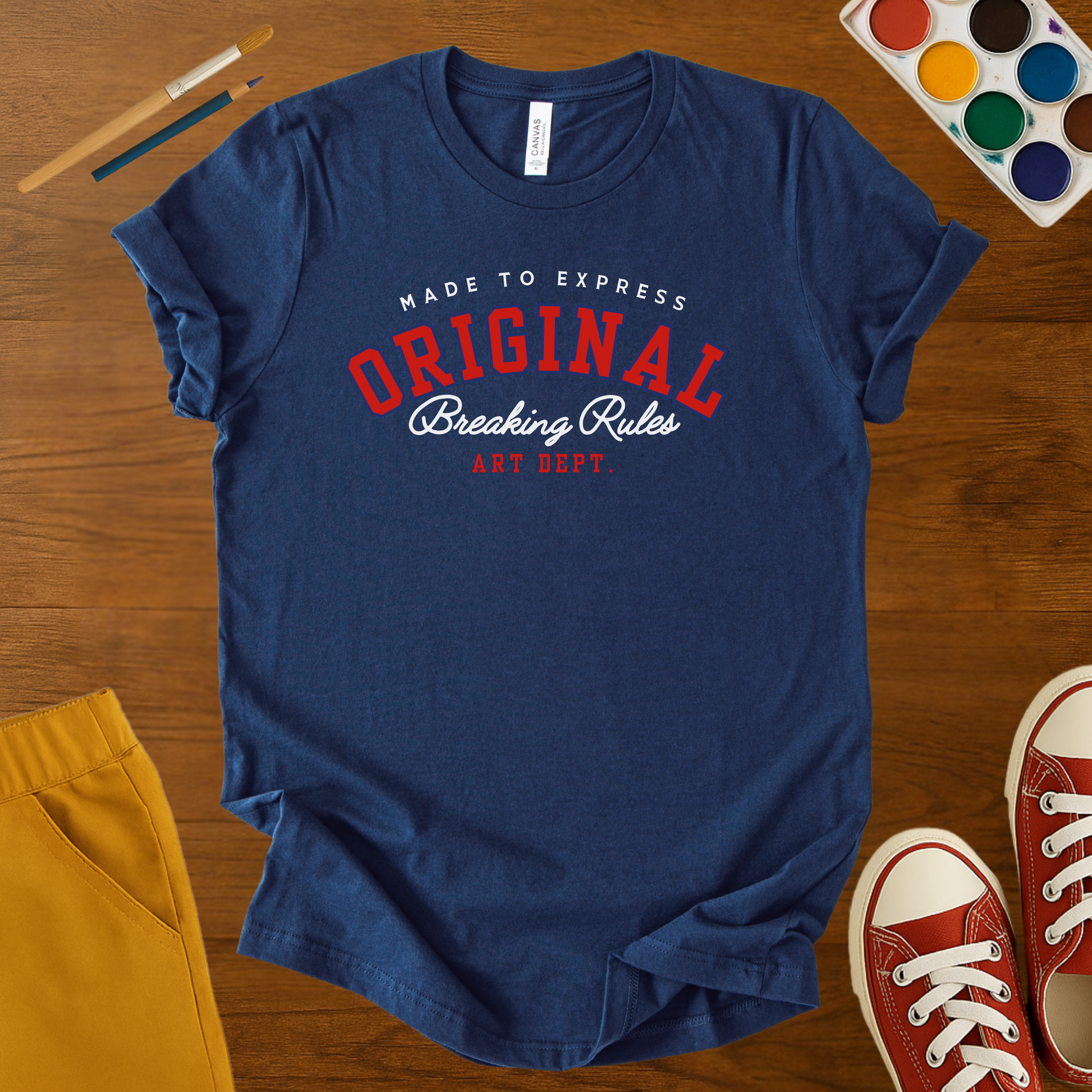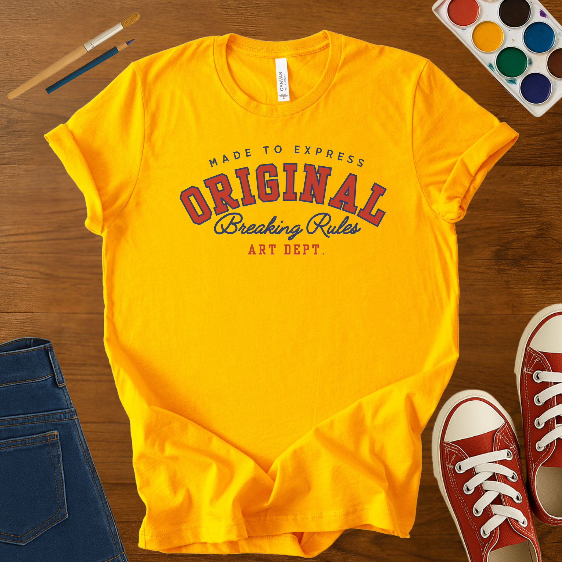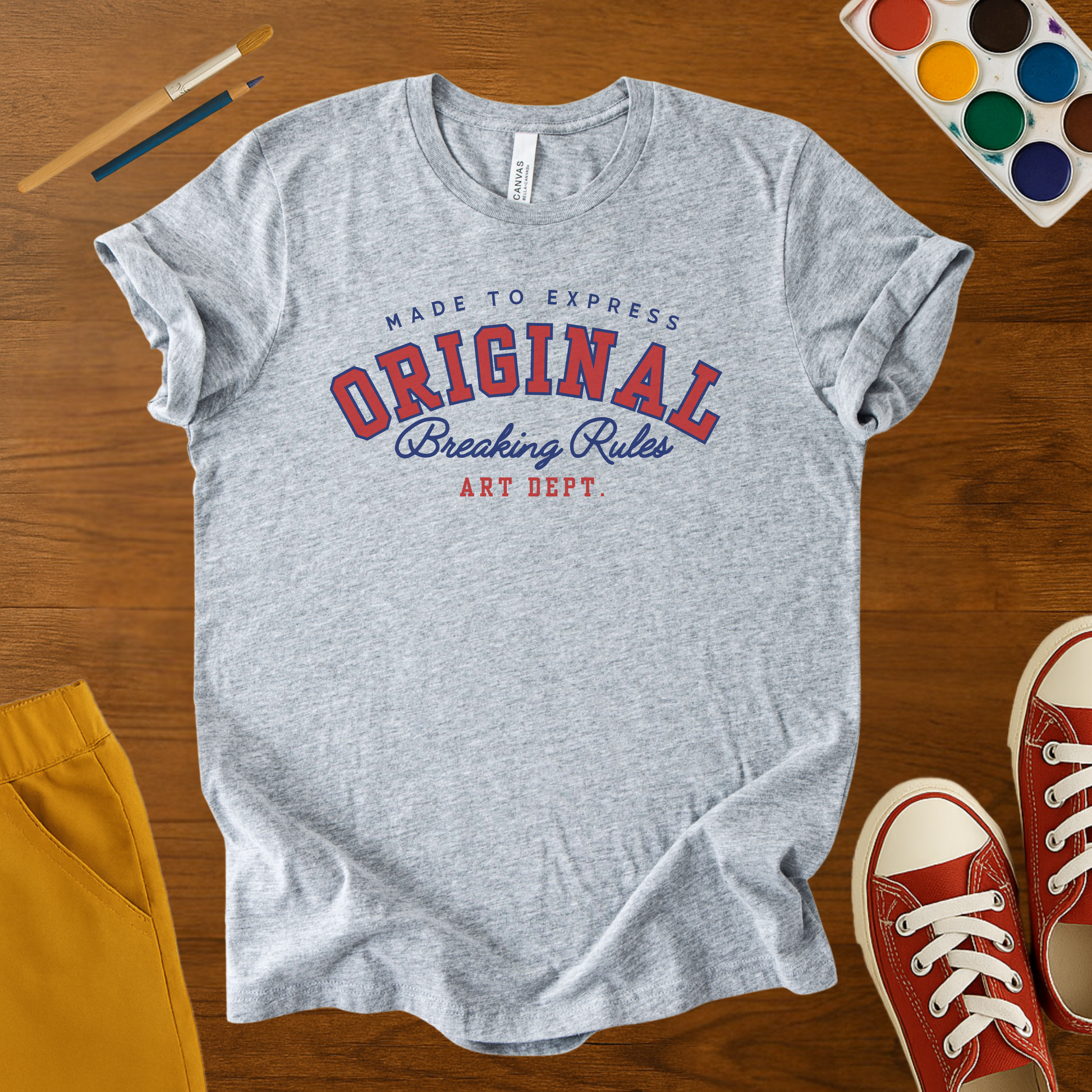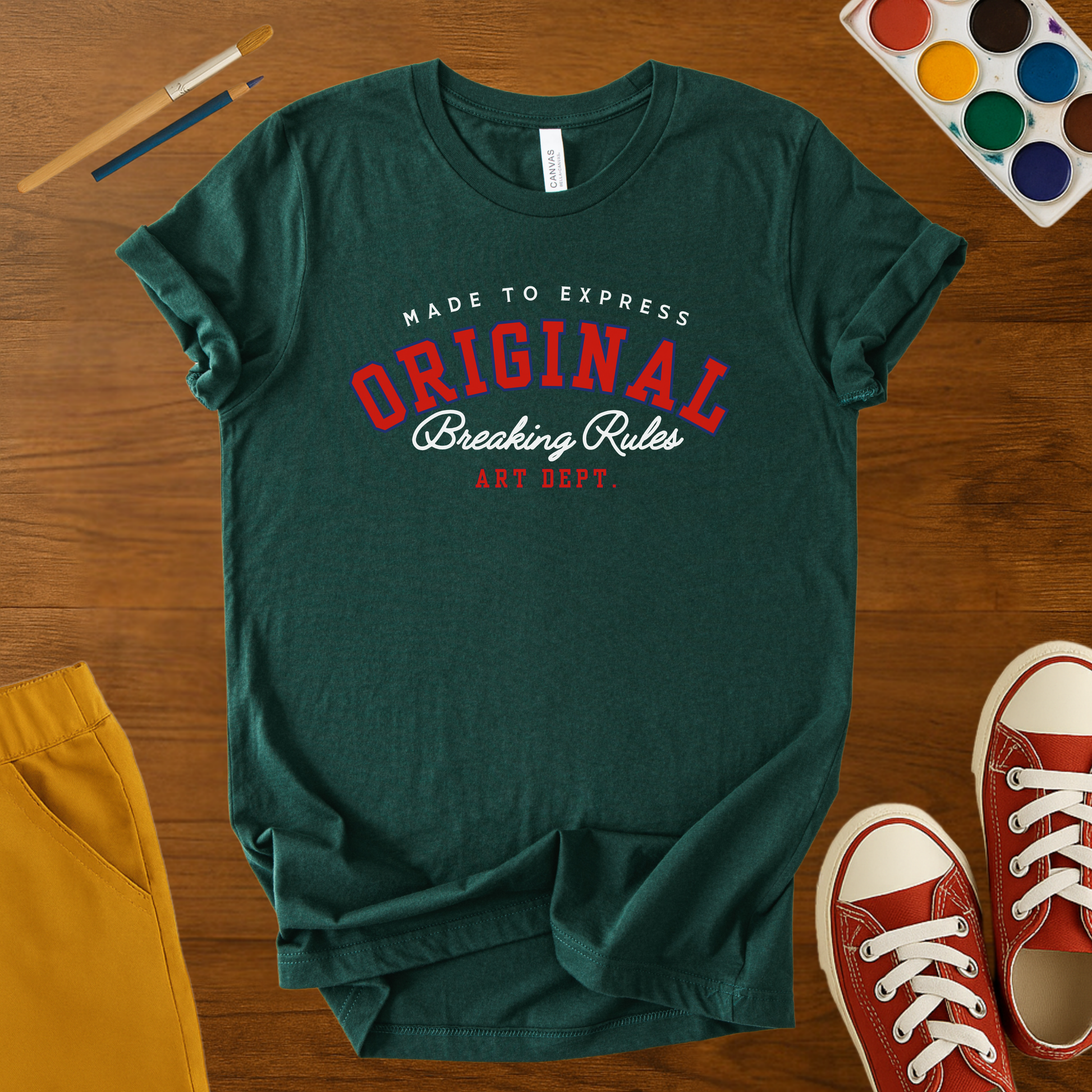 Varsity style with a rebellious streak. Made to express. Breaking rules in the best way. T-shirt for the kids who break rules with color, confidence, and creativity.