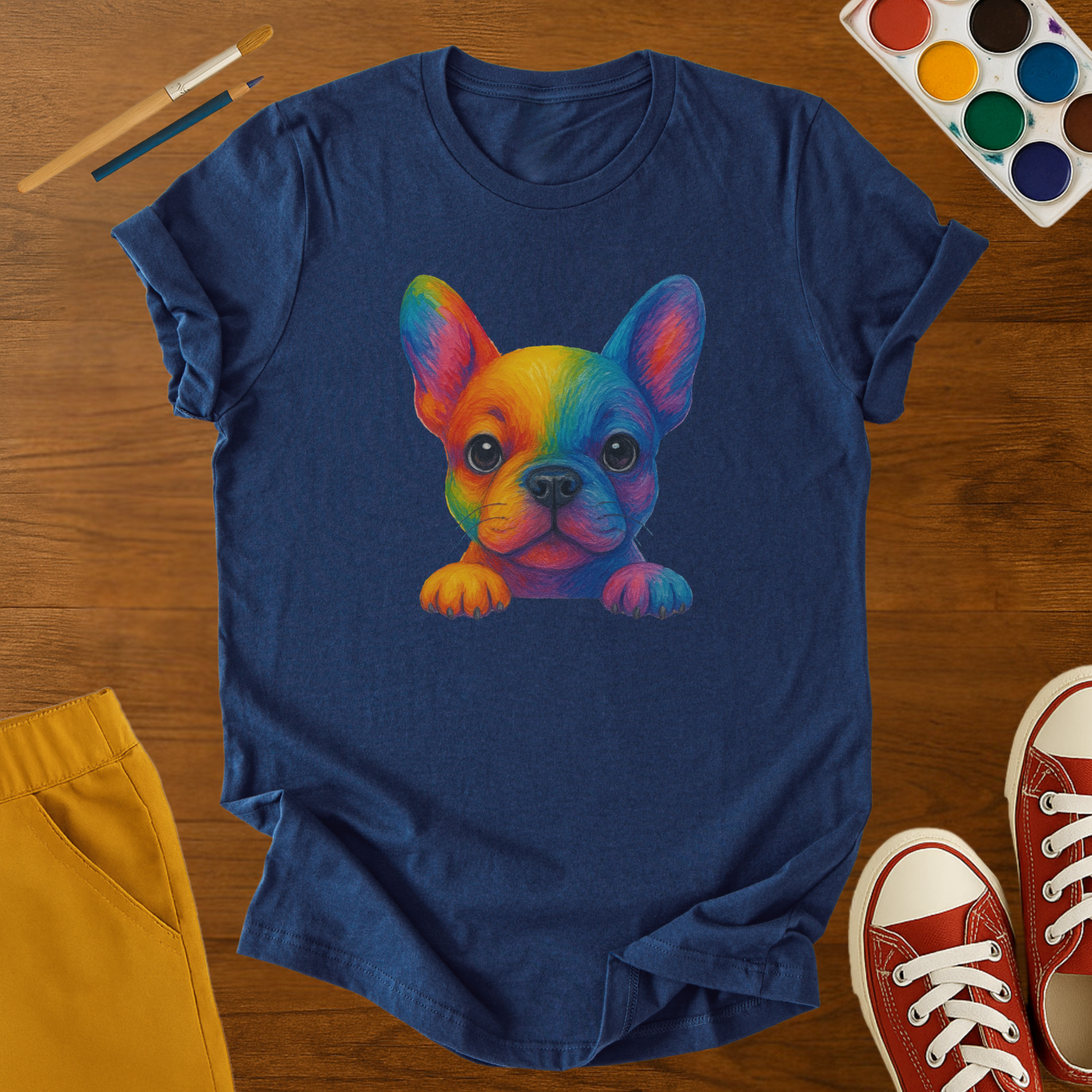 This rainbow French Bulldog tee captures pure curiosity and color. Featuring a wide-eyed pup in bold rainbow hues, it celebrates imagination, playfulness, and the joy of seeing the world with wonder.