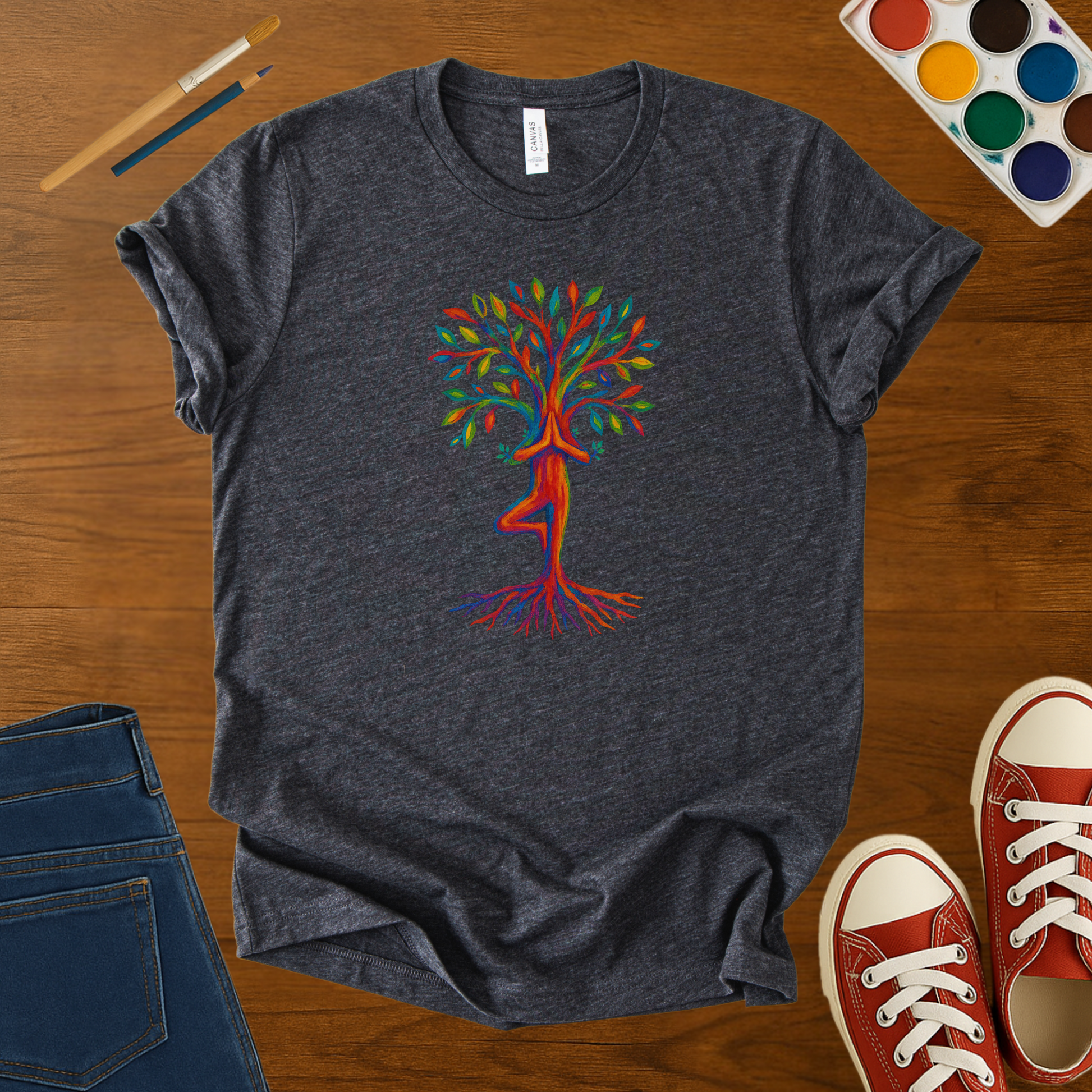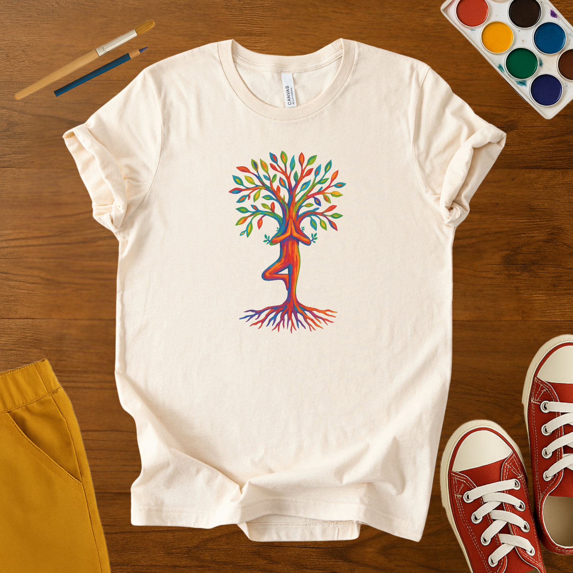 Bring color and mindfulness to their wardrobe with the Rooted in Color youth t-shirt. Featuring a Fauvist-inspired yoga tree pose design.