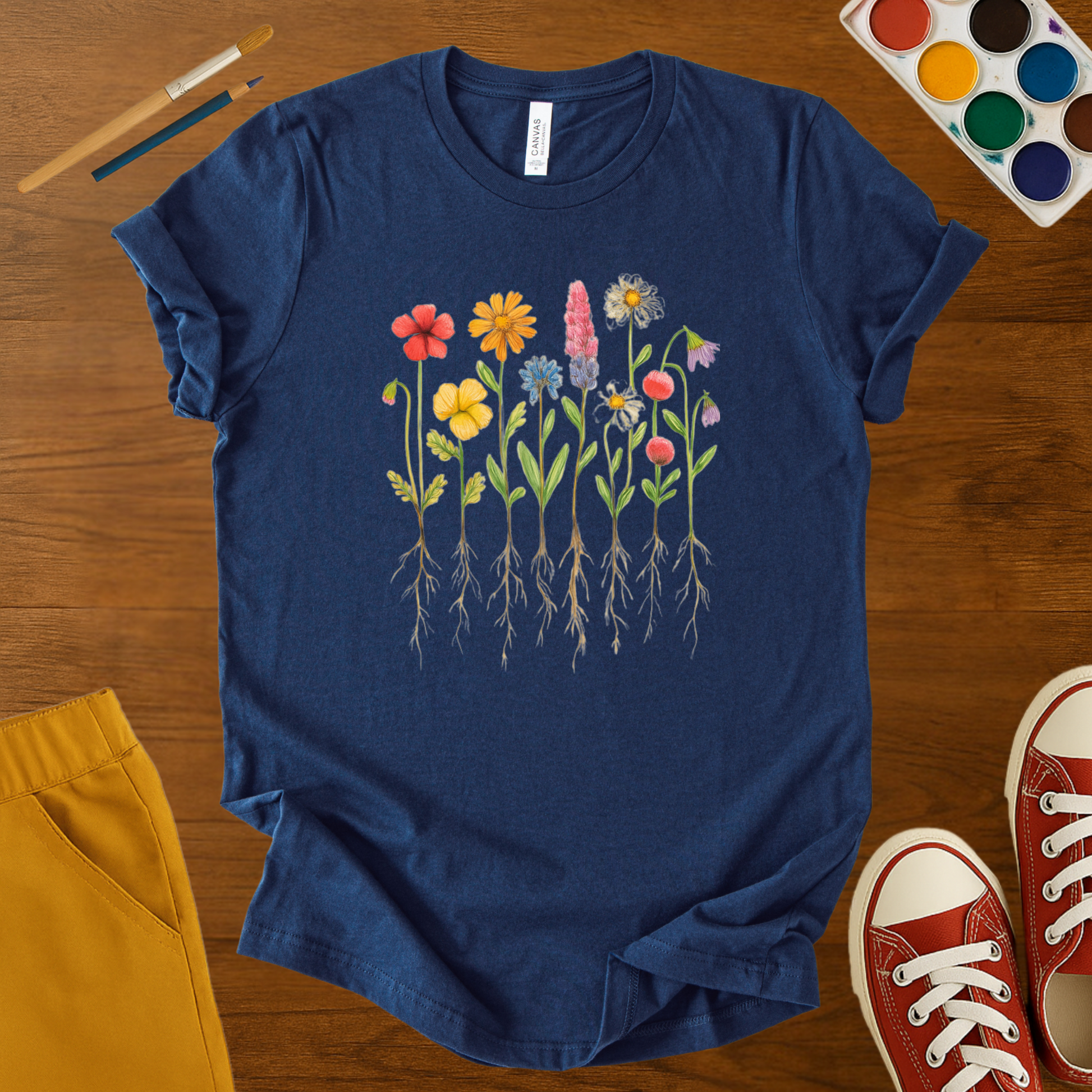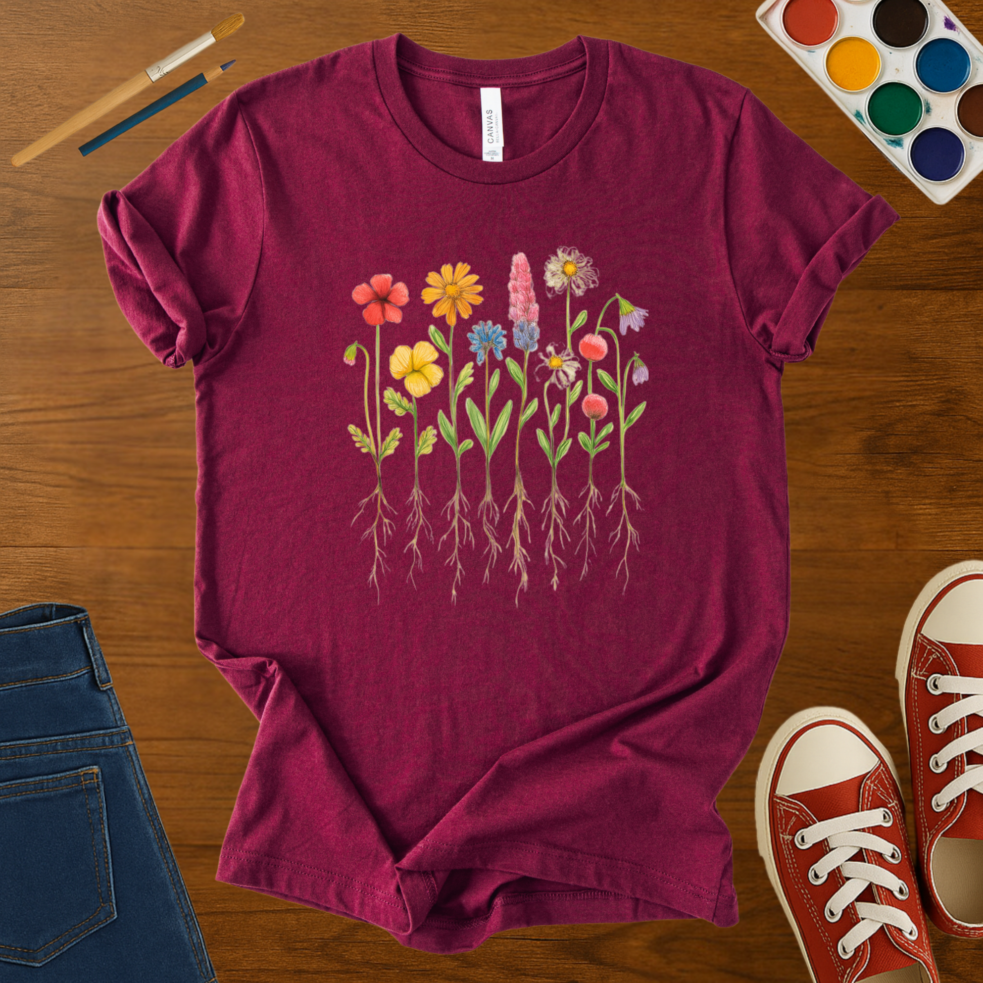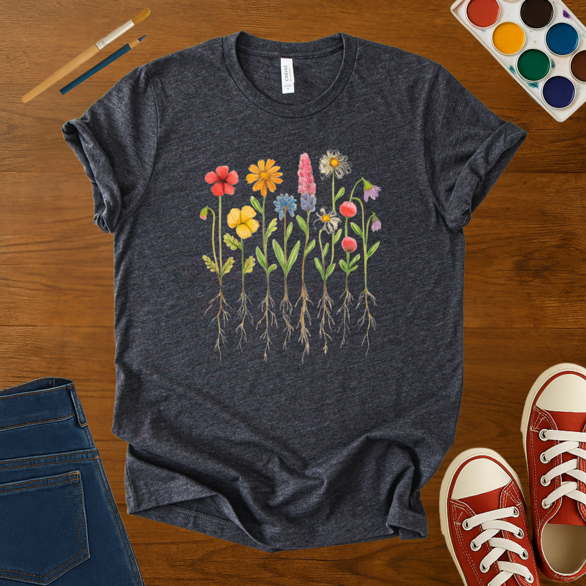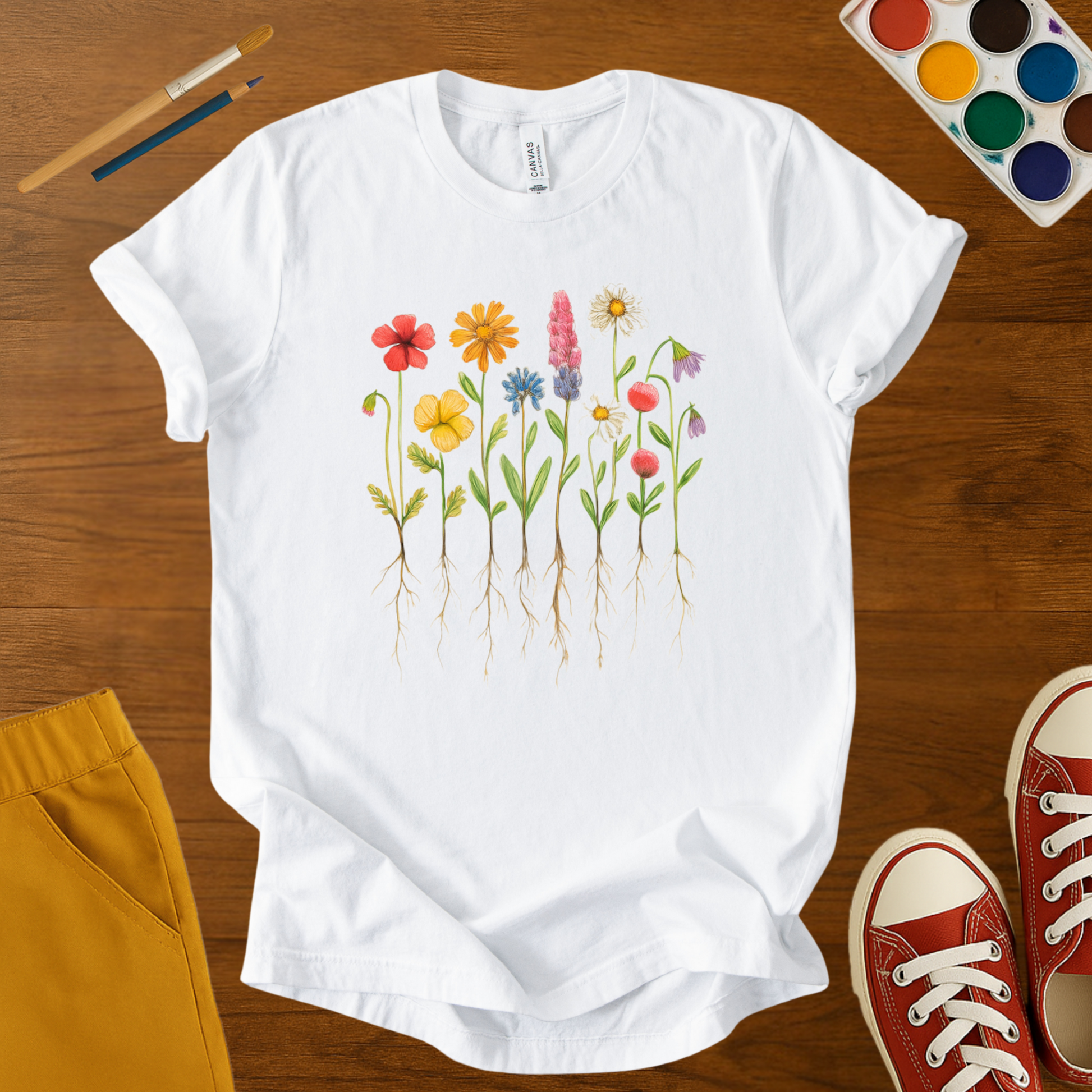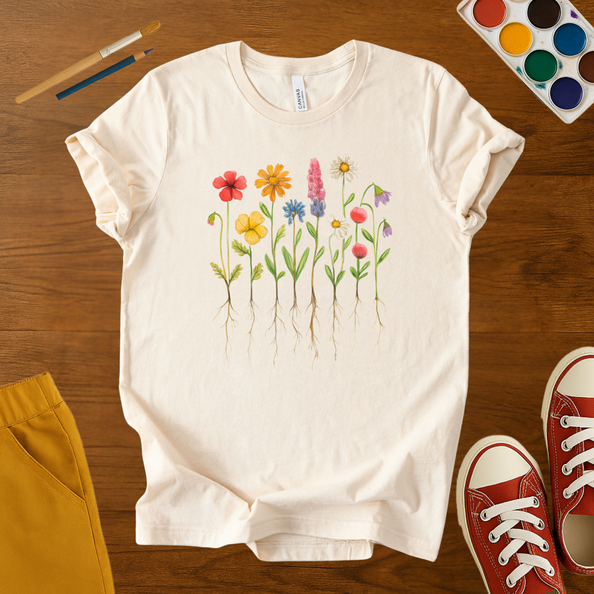 Let their creativity bloom with the Wildflower Roots Tee. This nature-inspired kids’ graphic shirt features colorful watercolor wildflowers with detailed roots, symbolizing growth, imagination, and connection to the earth.